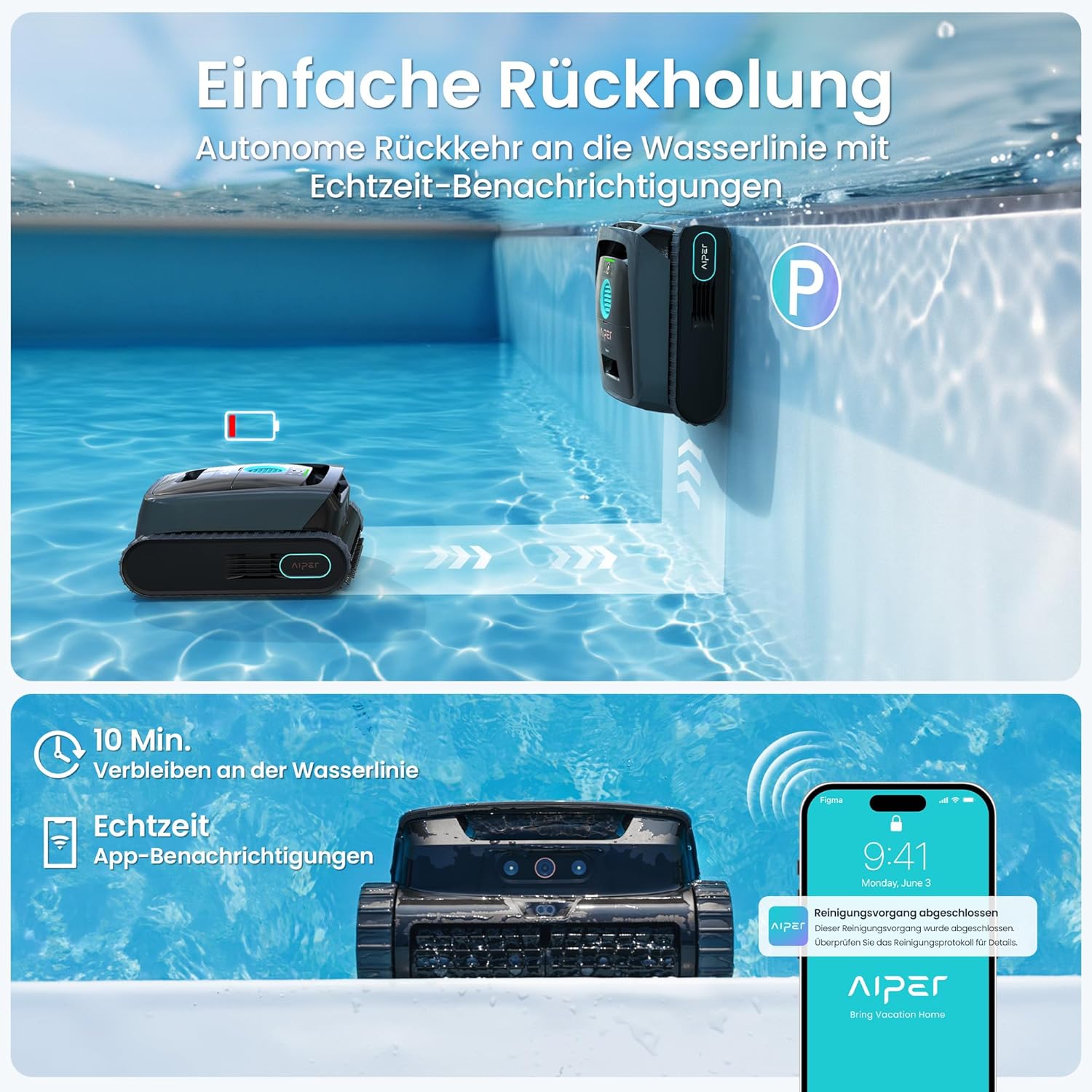 Innovatives Oberflächen-Parken: Nach getaner Arbeit parkt der Roboter für 10 Minuten direkt an der Wasserlinie. In Kombination mit Echtzeit-App-Benachrichtigungen ermöglicht dies eine mühelose Entnahme per Hand, ganz ohne tiefes Bücken oder Spezialwerkzeug.