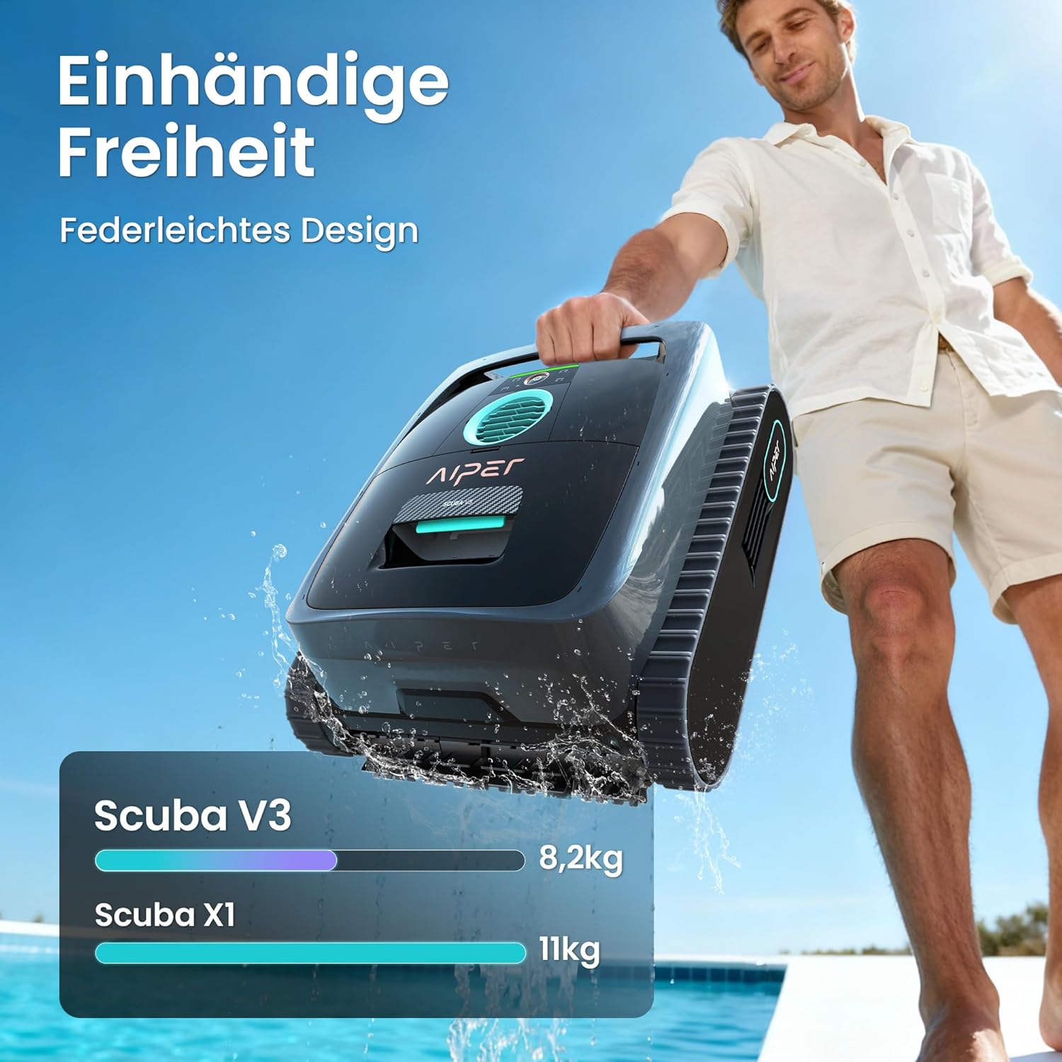 Federleichtes Handling: Mit einem Eigengewicht von nur 8,2 kg ist der Scuba V3 einer der leichtesten und handlichsten Roboter seiner Klasse. Das kompakte Design erleichtert das tägliche Einsetzen und Entnehmen erheblich.