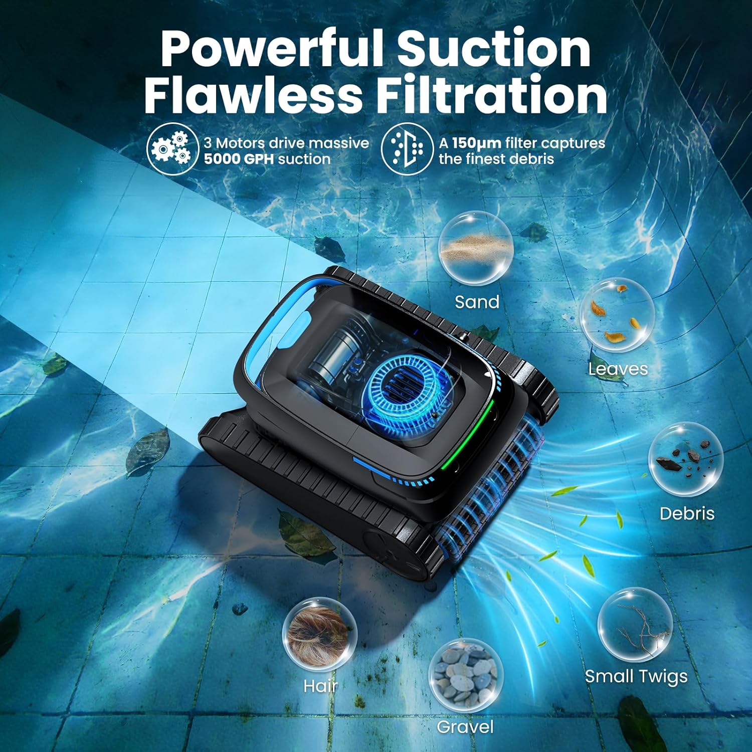 Hervorragende Saugkraft (18.927 LPH): Dank der drei bürstenlosen Motoren bietet der PC10 eine enorme Reinigungsleistung bei gleichzeitig hoher Energieeffizienz. Er entfernt mühelos Sand, Laub und festsitzenden Schmutz, um eine kristallklare Wasserqualität zu sichern.