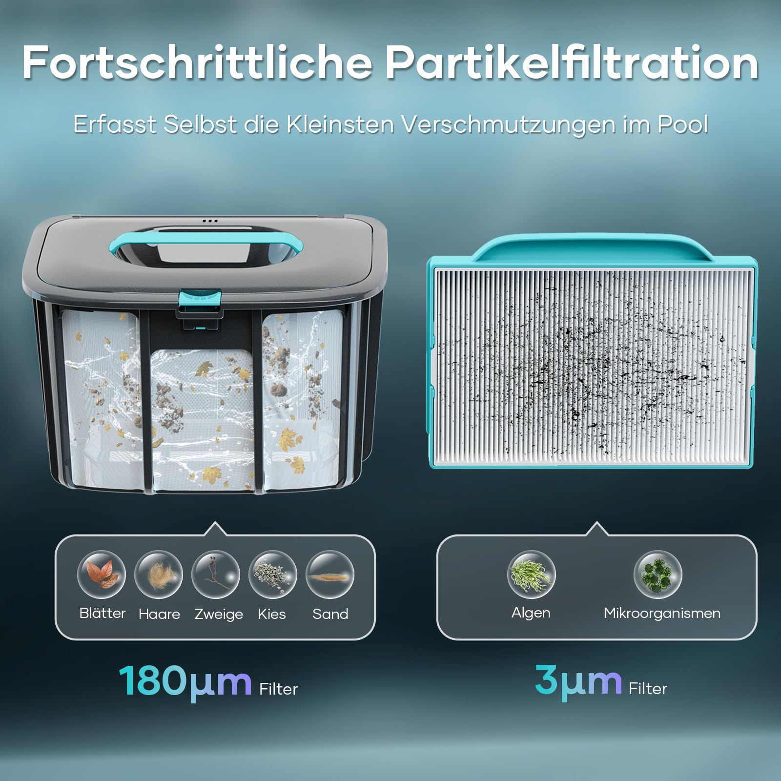 Duales Filtersystem: Die fortschrittliche Partikelfiltration kombiniert einen 180 µm Grobfilter für Blätter und Zweige mit einem ultrafeinen 3 µm Filter, der selbst kleinste Schmutzpartikel zuverlässig einfängt.