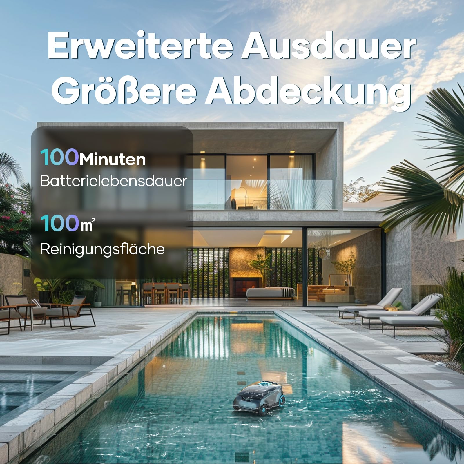 Maximale Ausdauer: Der 7.800 mAh Akku bietet eine beeindruckende Laufzeit von 100–130 Minuten, ideal für gründliche Reinigungsvorgänge in Pools bis zu 100 m².