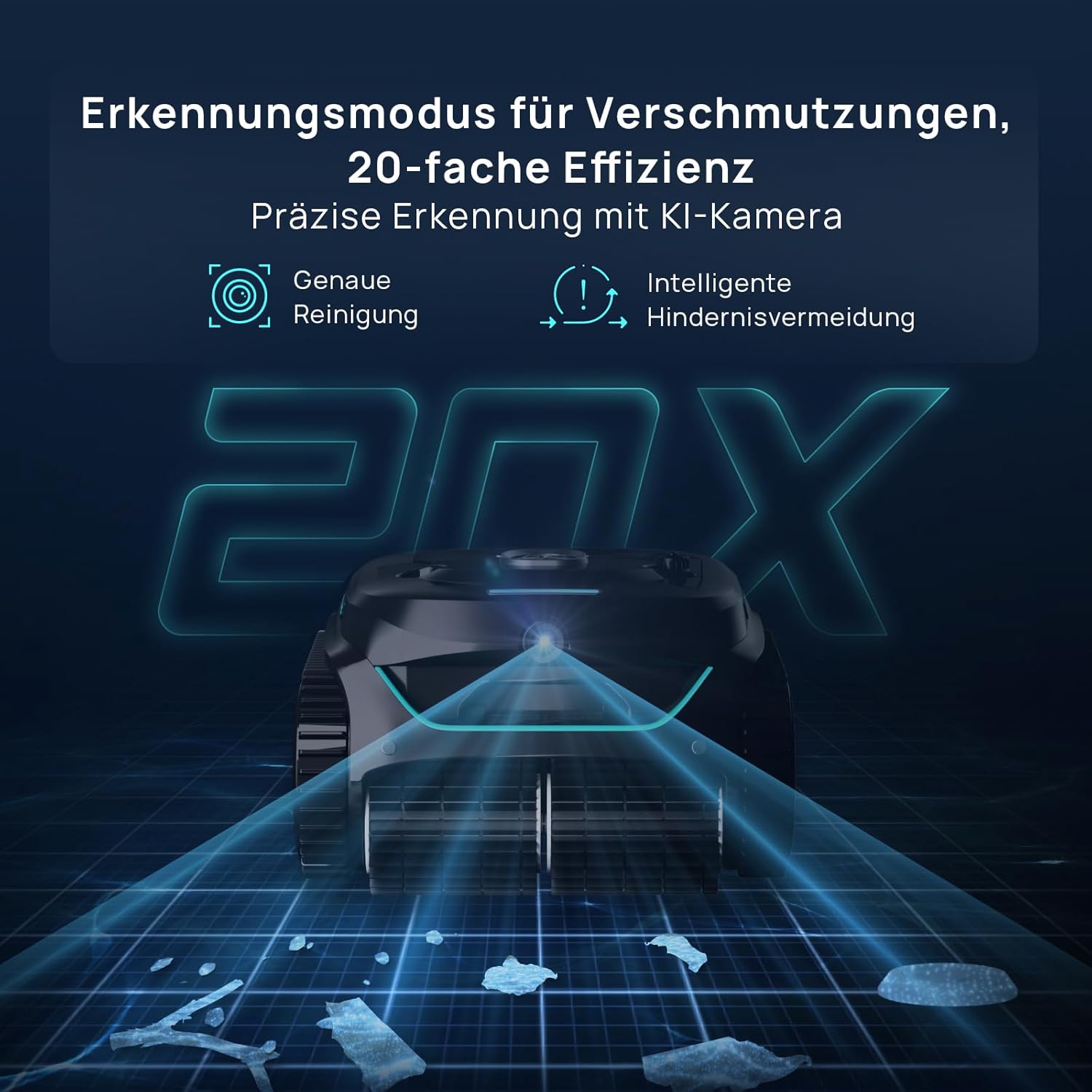 KI-Visuelle Navigation & Dust-Finder: Dank der branchenführenden KI-Kamera erkennt der Roboter Verschmutzungen am Poolboden aktiv. Anstatt nach dem Zufallsprinzip zu fahren, visiert er Schmutzansammlungen gezielt an, was die Reinigungseffizienz im Vergleich zu Standardmodellen massiv steigert.