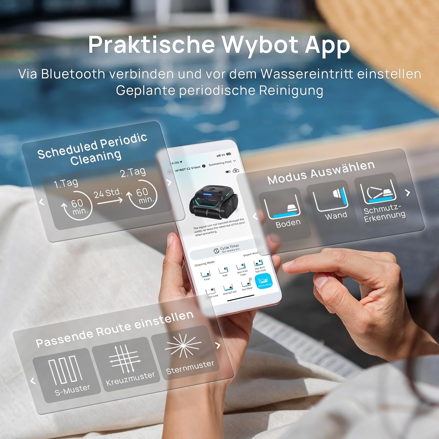 6 Experten-Pfadstrategien: Für jede Poolgeometrie die richtige Route. Im Expertenmodus stehen für den Boden (S-Form, Kreuz, Stern) und für die Wände (N-, H-, V-Form) maßgeschneiderte Pfadplanungen zur Verfügung, um tote Winkel komplett zu eliminieren.