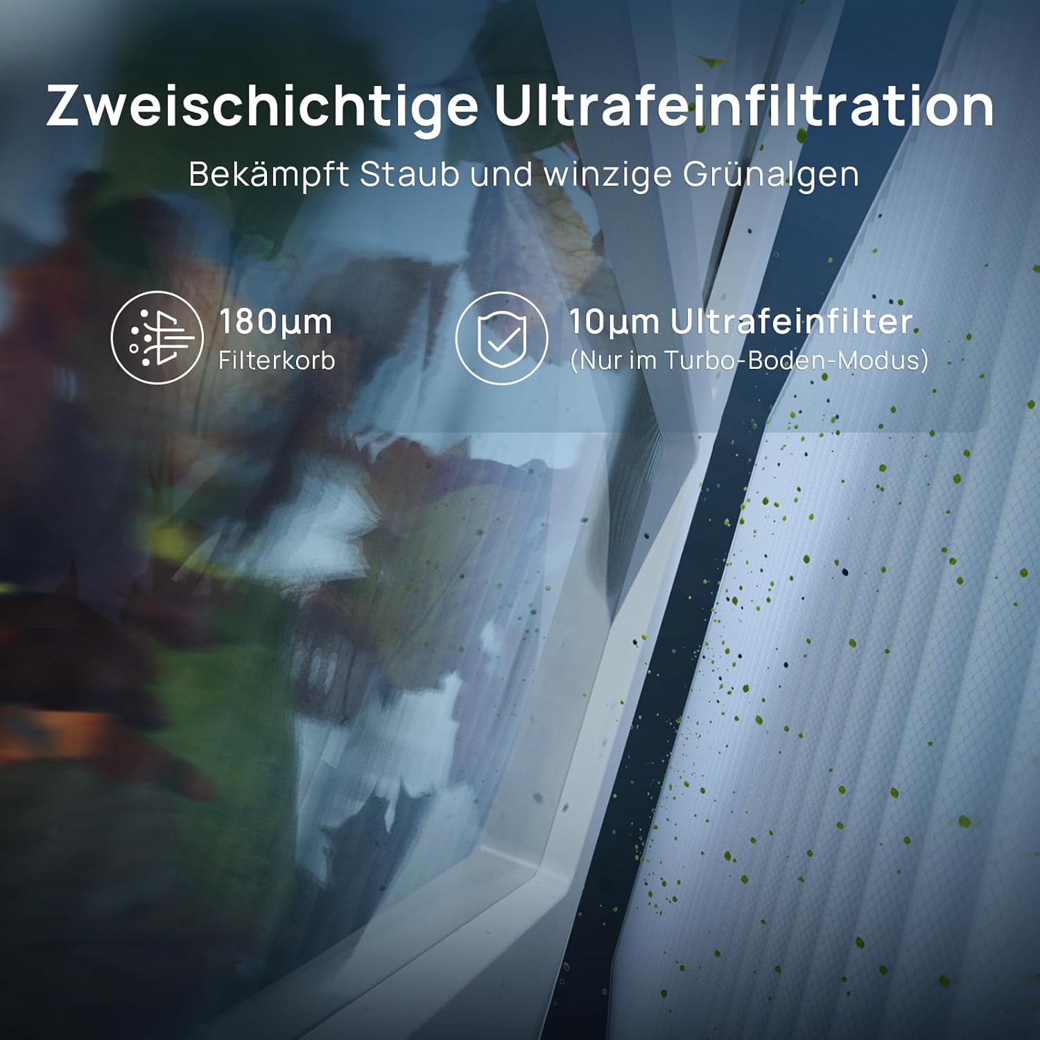 Ultrafeine Doppelfiltration inkl. HEPA: Das 2-stufige Filtersystem mit zusätzlichem HEPA-Filter im Turbo-Modus fängt selbst feinsten Staub, Sand und Mikropartikel auf. In Kombination mit dem bürstenlosen Hochleistungsmotor sorgt er für kristallklares Wasser in Pools bis zu 200 m².