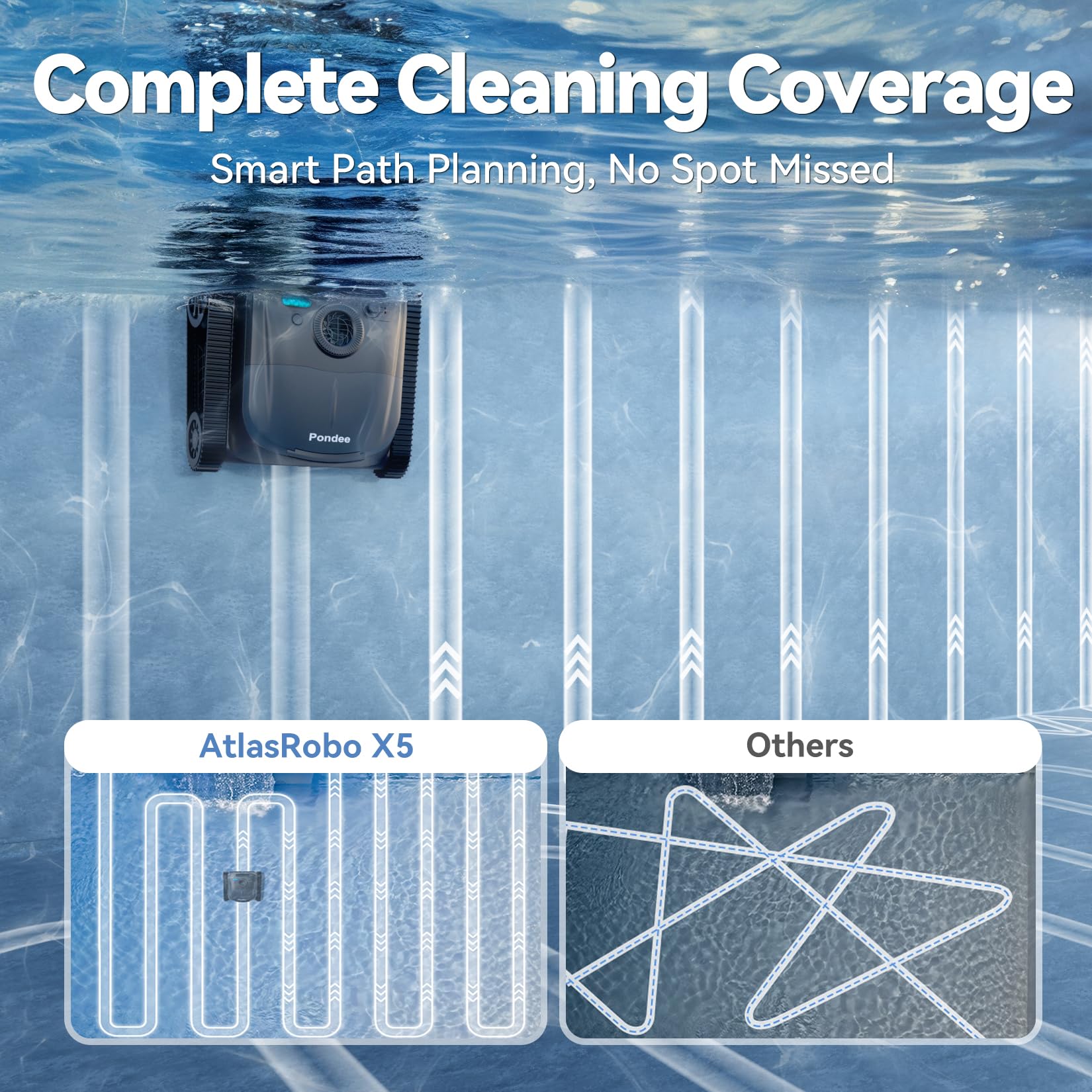 Herausragende Akkulaufzeit: Mit bis zu 180 Minuten Reinigungszeit pro Ladung bewältigt der X5 selbst riesige Poolflächen. Dank der Schnellladetechnologie ist das Gerät in nur 2,5 Stunden wieder voll einsatzbereit.