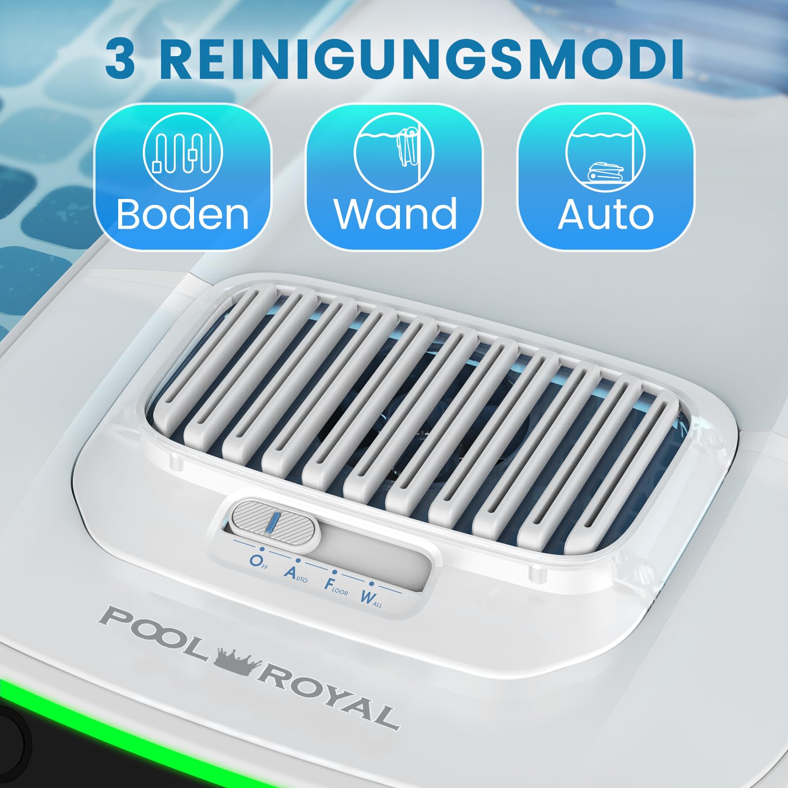 Setzen Sie auf modernste Technik mit dem Pool-Royal PC10 Modell 2025. Dieser kabellose High-End Poolroboter ist mit einem leistungsstarken Drei-Motoren-System ausgestattet und reinigt vollautomatisch den Boden, die Wände und die Wasserlinie. Dank der Kombination aus zwei Antriebsmotoren und einem effizienten Pumpenmotor bietet er eine unübertroffene Tiefenreinigung für unterirdische und oberirdische Schwimmbecken.