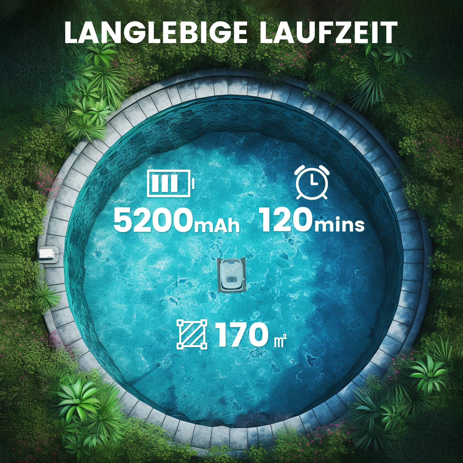 Maximale Ausdauer & Reichweite: Der Hochleistungsakku ermöglicht eine ununterbrochene Reinigung von bis zu 120 Minuten und deckt dabei Flächen von bis zu 170 m² ab.